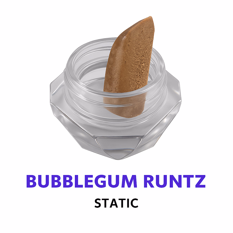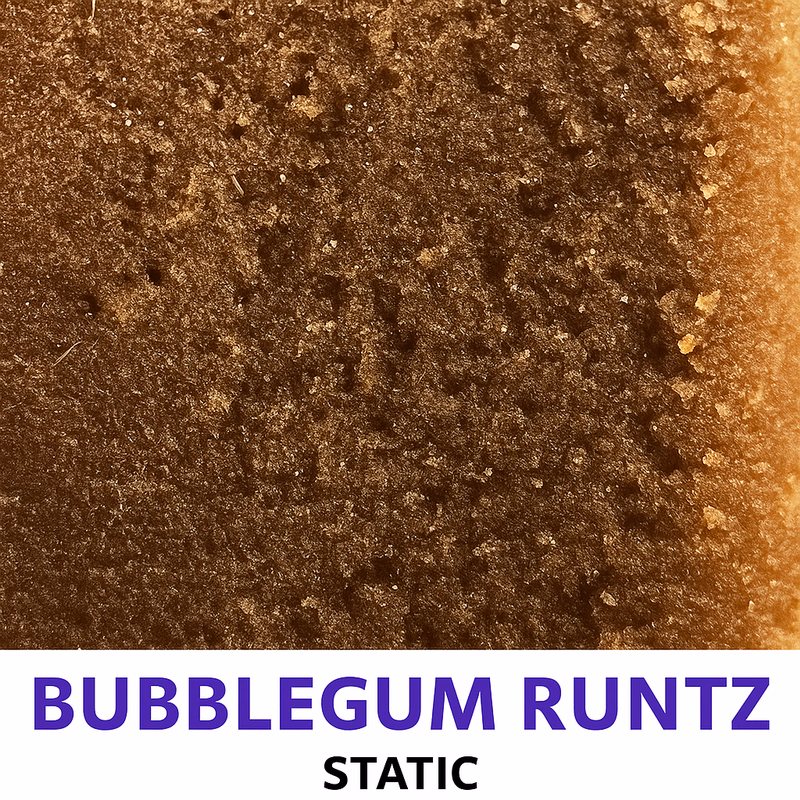 Aroma: 🍬 Bubblegum Runtz 90/135u Static Hash exudes a sweet, candy-shop fragrance filled with pink bubblegum, berry, and citrus notes. Its aroma is thick and creamy, with subtle earthy and floral undertones adding depth to its sugary profile.